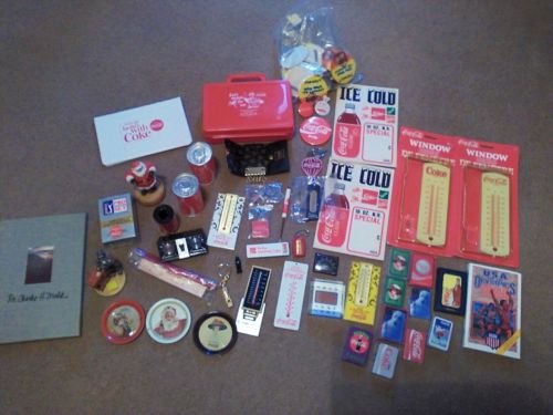 Title (ebay affiliate link): Huge Lot 50+ Coca Cola Memorabilia Cards, thermostats, keychains, pins MORE Coke
