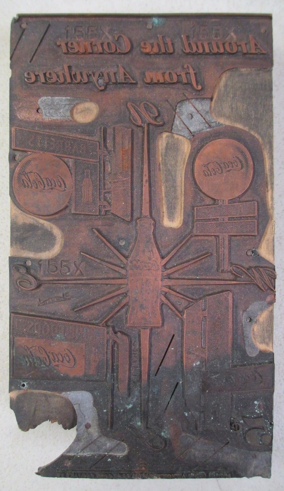 VINTAGE COCA COLA BOTTLE SIGNS 5 CENT COPPER & WOOD 7 1/4" PRINTING BLOCK STAMP