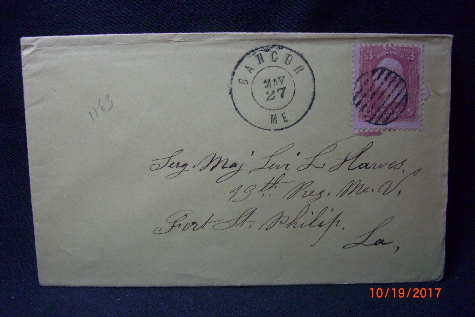 Title (ebay affiliate link): Sc # 65 on 1863 Env Bangor Me to Sgt Maj 13th Reg''t Me Vols to Fort St Philip La