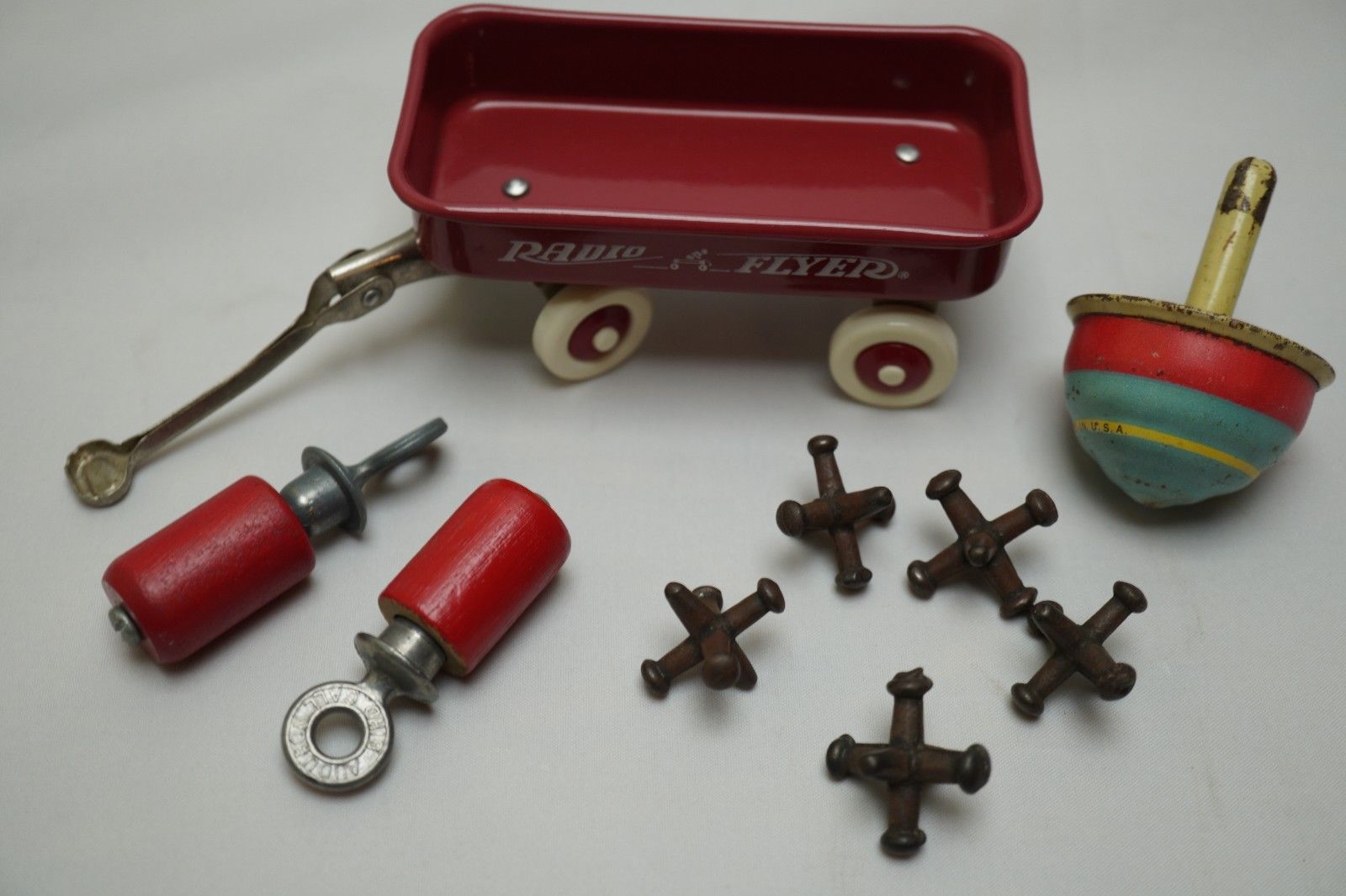 Title (ebay affiliate link): Lot of Vintage Toys - Aubon Bird Calls - Radio Flyer - Jacks - Top