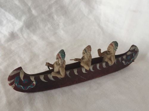 Vintage Celluloid Indians Rowing In Wooden Canoe Toy
