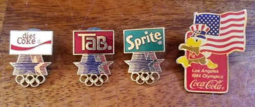Title (ebay affiliate link): 4 Coca-Cola Los Angeles 1984 Olympic pins TAB diet coke sprite