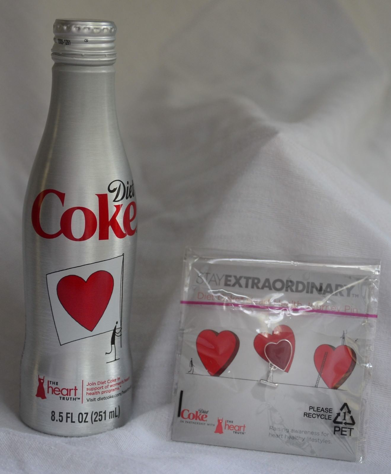 Title (ebay affiliate link): COCA-COLA Diet Coke Red Dress Heart Truth ALUMINUM BOTTLE & PIN - EMPTY BOTTLE