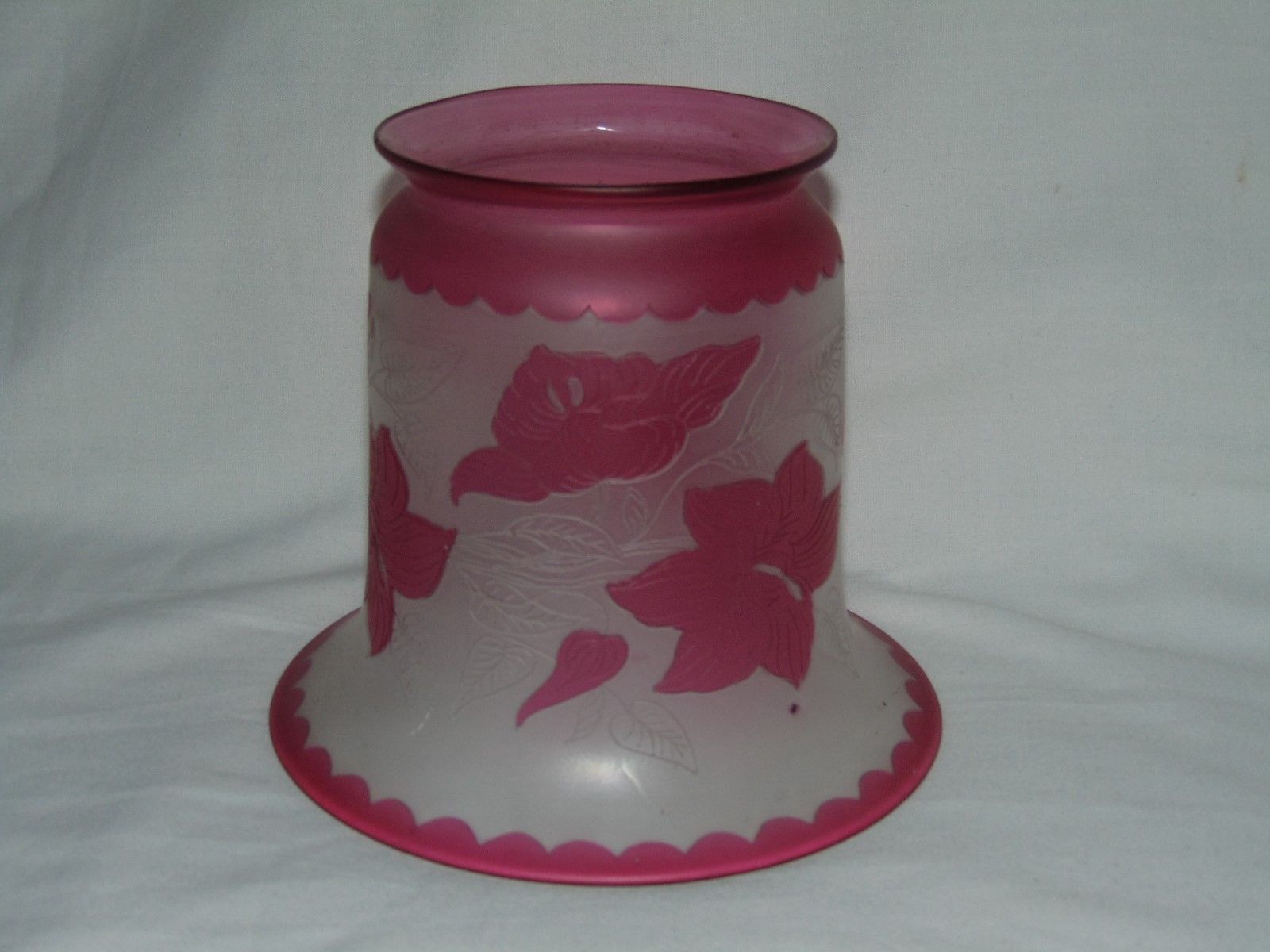 ANTIQUE CRANBERRY GLASS ACID ETCHED FLOWER LEAF KEROSENE OIL GAS LAMP SHADE