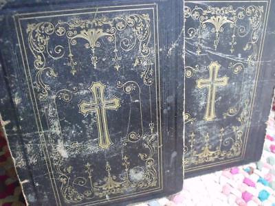 2 Primitive Antique Book Sides Turned Decor Gold Embossed Leather With Crucifix