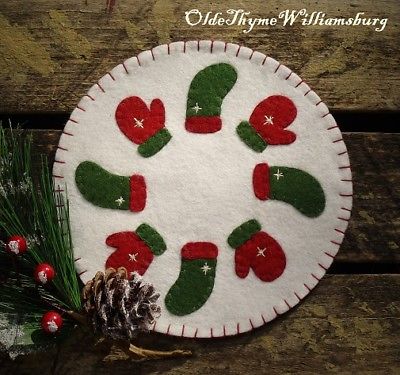 Title (ebay affiliate link): Primitive Stitchery CHRISTMAS Stockings & Mittens Penny Rug ~ Winter Candle Mat