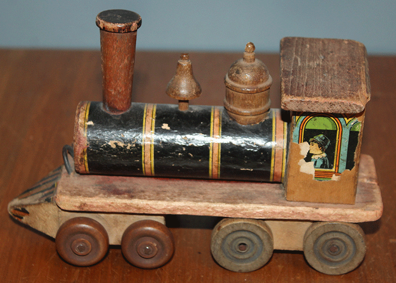 Title (ebay affiliate link): ANTIQUE Wooden Bliss RAILROAD TRAIN ENGINE With Litho