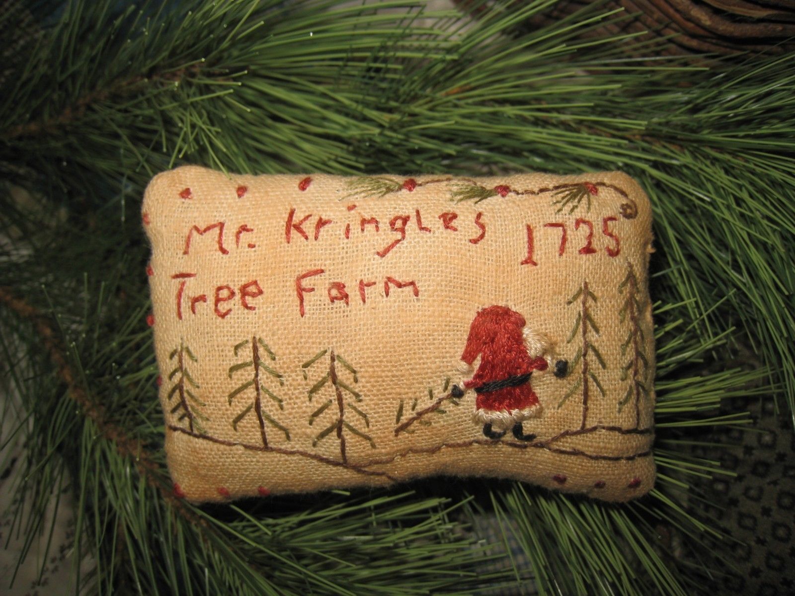 Title (ebay affiliate link): Primitive tiny Sampler Pillow *1725 Mr. Kringles Tree Farm* Folk Art Christmas