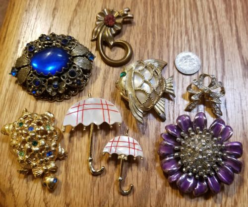 Title (ebay affiliate link): VTG Old/Antique Costume Jewelry Brooch Pin Lot W Rhinestone Fish/Umbrella/Turtle