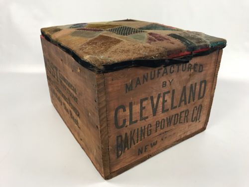 Title (ebay affiliate link): ANTIQUE Cleveland Baking Powder Co Advertising Wooden Crate W/ Patch Quilt Top