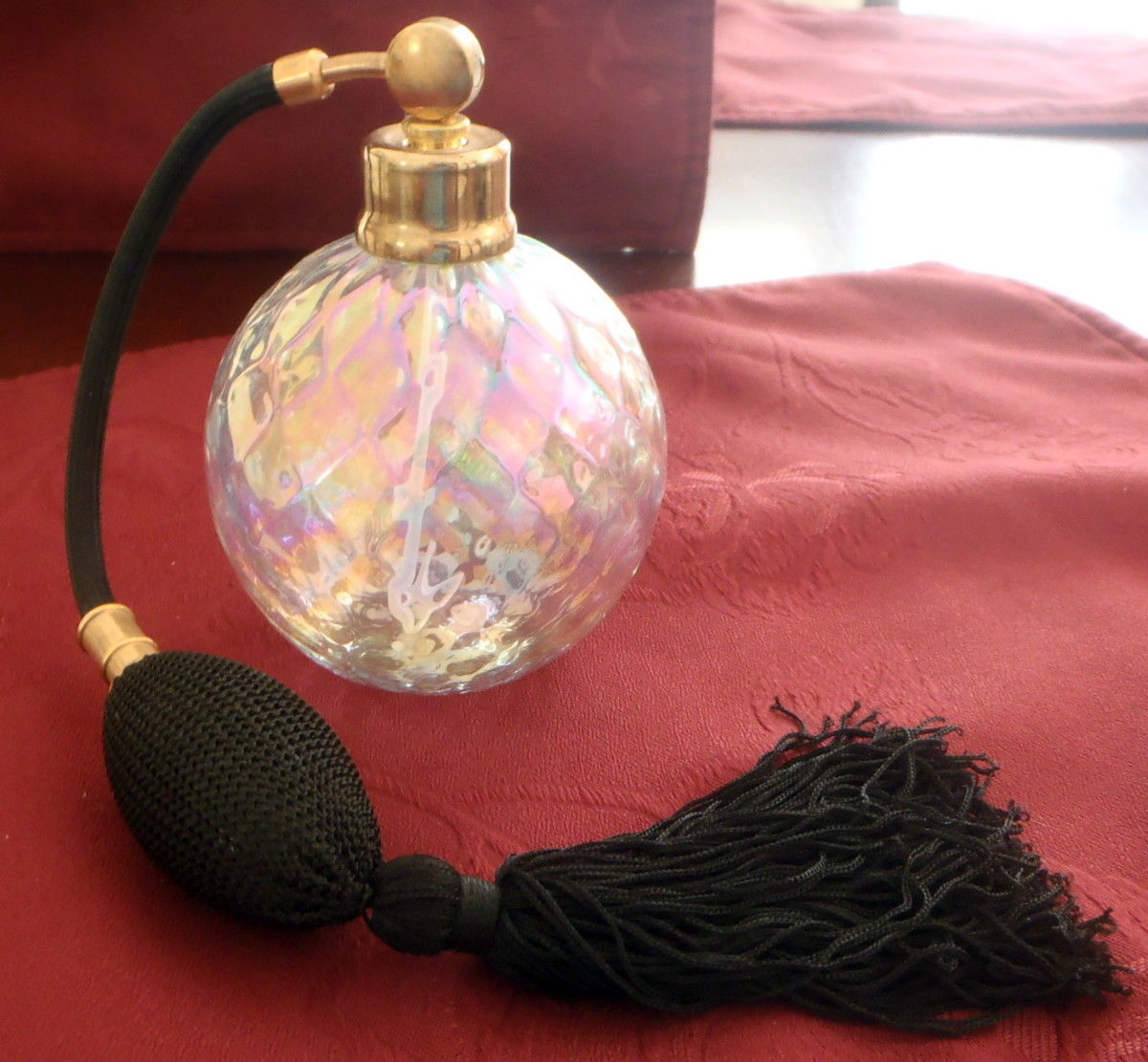 Title (ebay affiliate link): Vintage Iridescent Shimmery Clear Perfume Bottle with Attached Atomizer