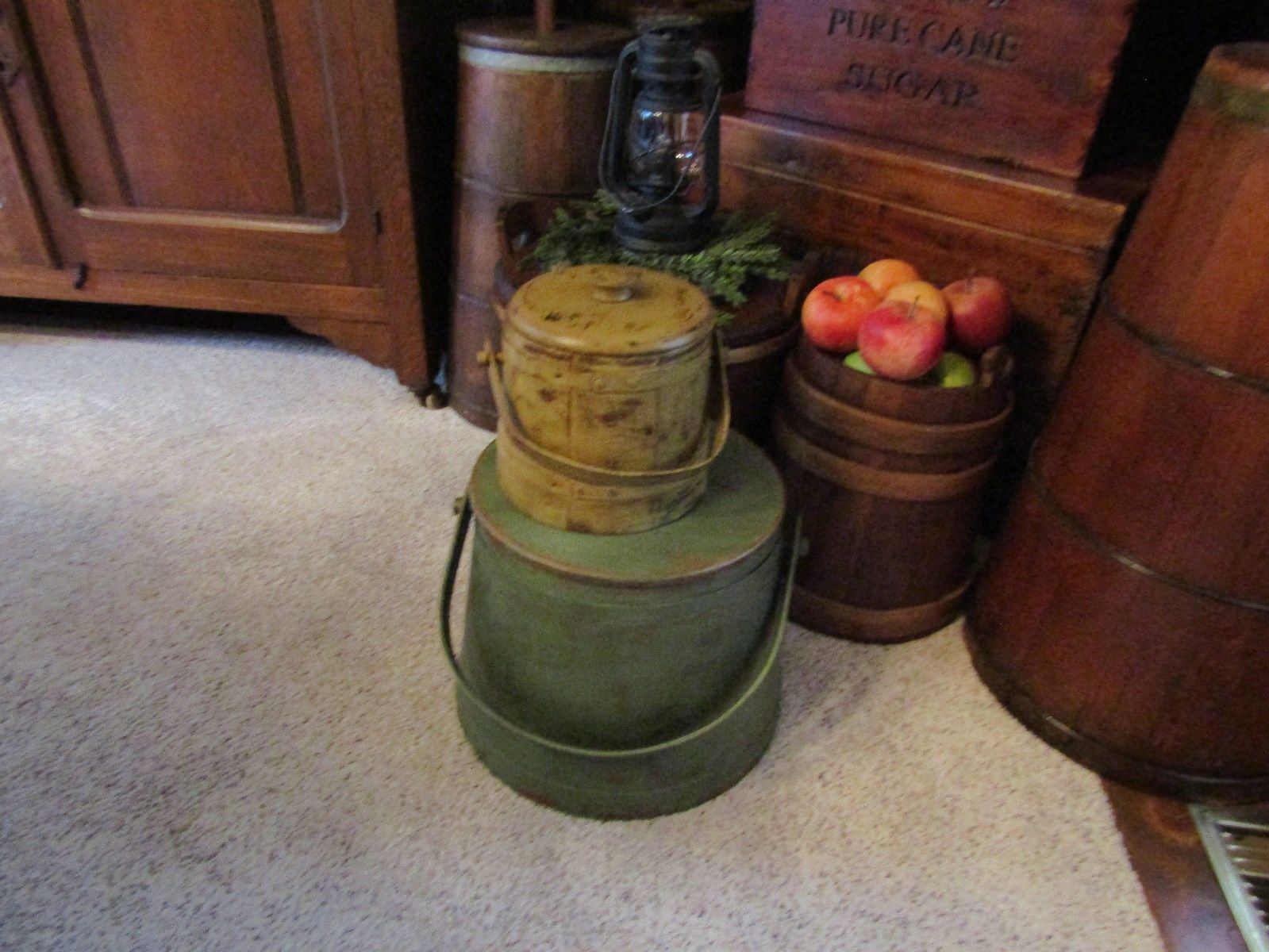 Title (ebay affiliate link): VINTAGE X-LARGE FIRKIN BUCKET W/2 METAL BANDS-ORIGINA LID-10" TALL-BAYBERRY GREE