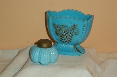 VINTAGE BLUE MILK GLASS SUGAR FRUIT GOLD SALT SHAKER
