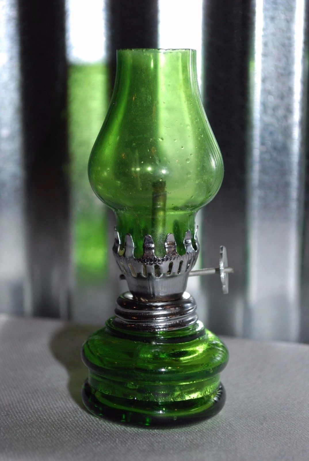 Title (ebay affiliate link): Vintage - Miniature - Green Glass Oil Lamp - 3 7/8" tall - good condition