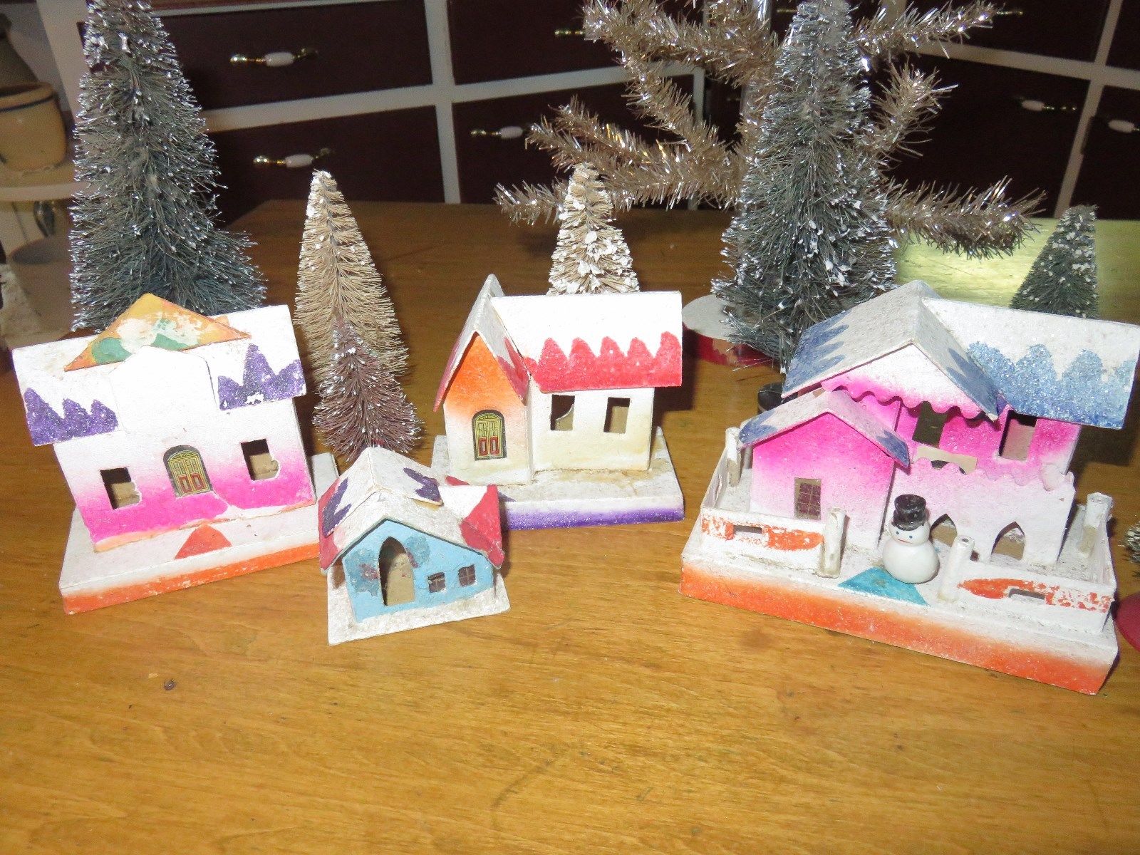 Title (ebay affiliate link): VINTAGE ANTIQUE PUTZ COATED CARDBOARD MICA GLITTER LOT OF 4 VILLAGE BUILDINGS