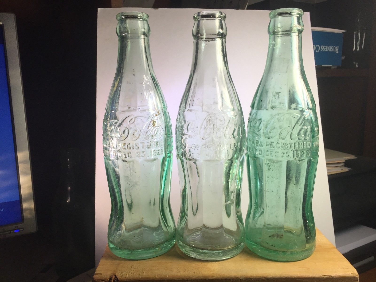 Title (ebay affiliate link): 3 Coca-Cola bottles 1923 SANFORD, N.C.& MERIDAN, MISS. 1915 STAUNTON, VA.,
