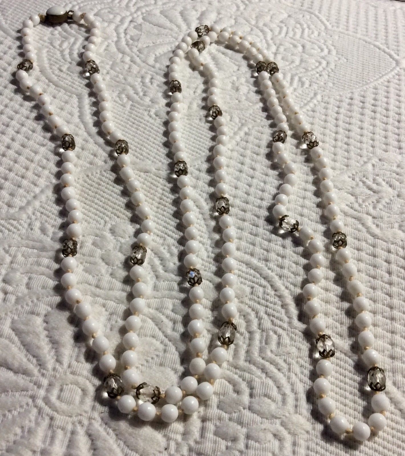 Title (ebay affiliate link): VINTAGE GERMANY FACETED PRISM & MILK GLASS WHITE BEADED NECKLACE 31.5" LONG