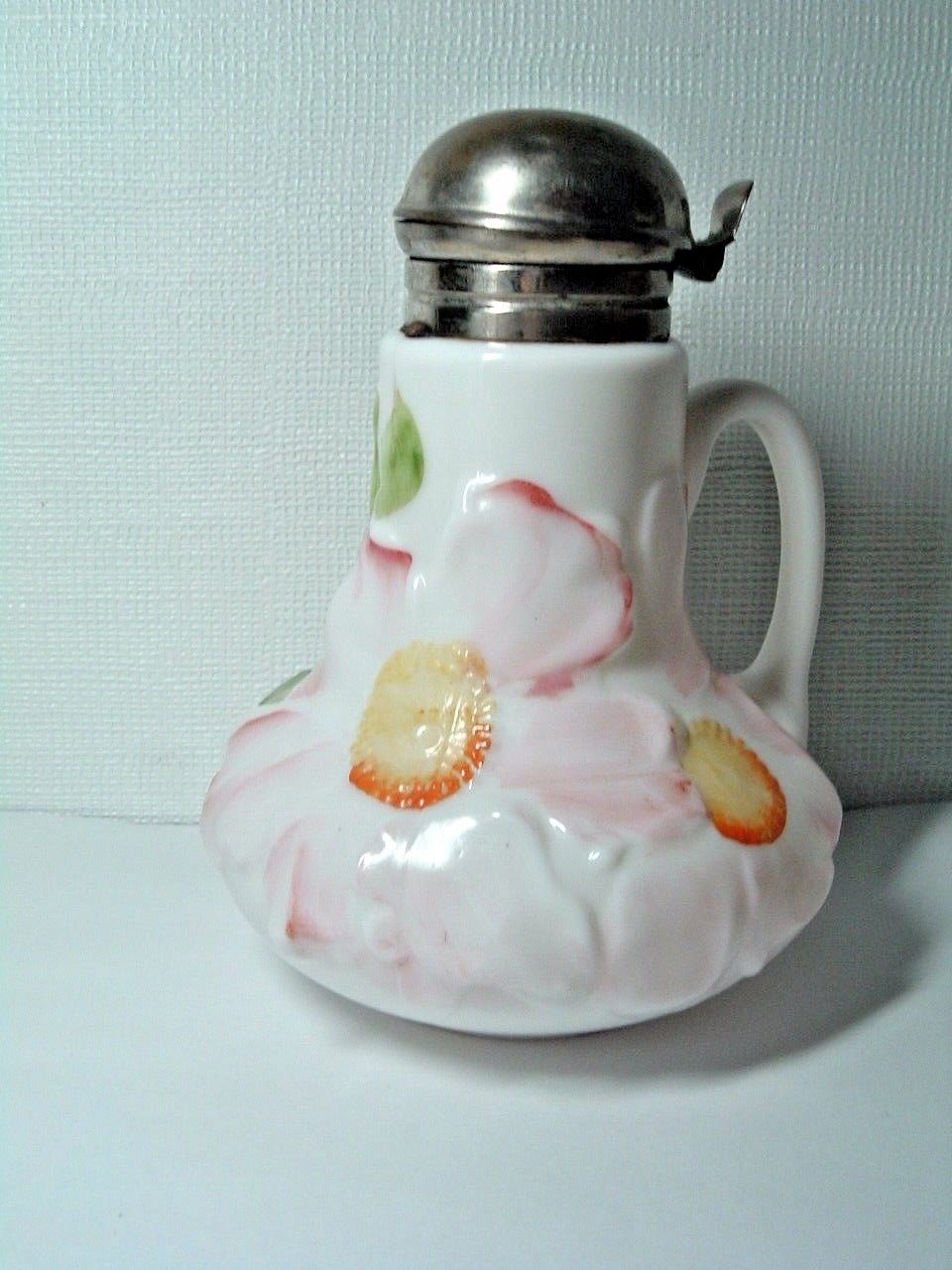 Antique Art Milk GLASS Syrup Pitcher Dithridge PANSY, BULGE BOTTOM 1895