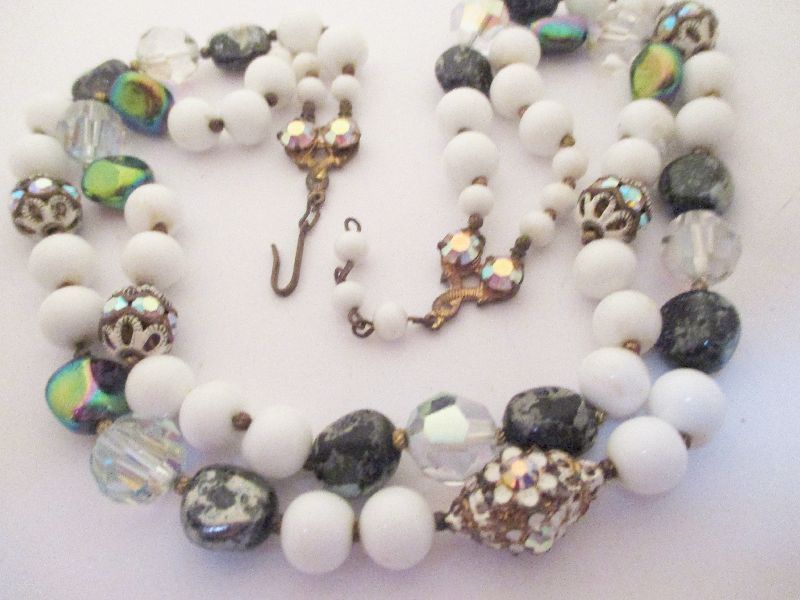 Rare VINTAGE ESTATE 2 STRAND MILK GLASS FILIGREE CRYSTAL Multi BEAD NECKLACE