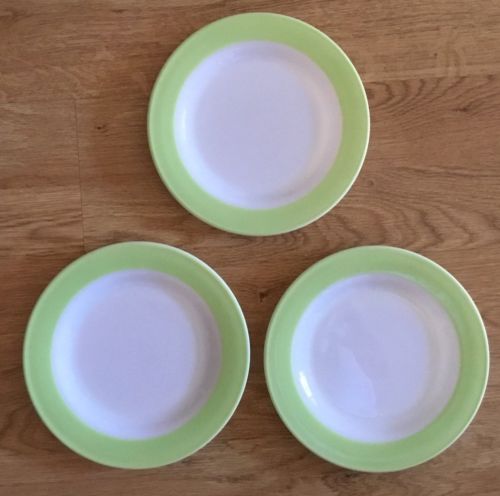 Title (ebay affiliate link): Vintage PYREX (3) Dinner Plates Milk Glass Lime Green Band Made in USA