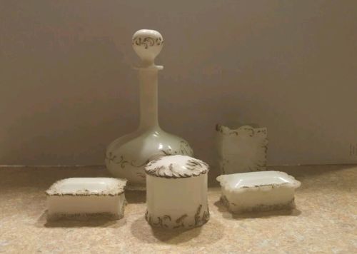 Title (ebay affiliate link): 6 Piece Victorian Milk Glass Vanity Dresser Set Gilt Edge Circa 1930''s