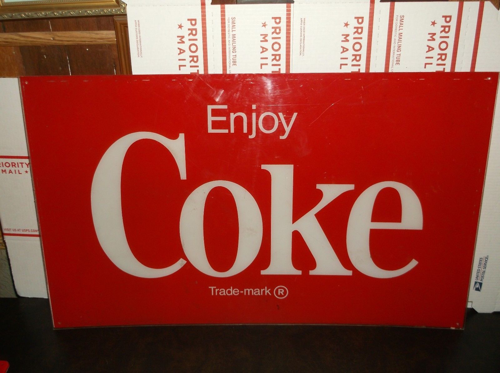 Title (ebay affiliate link): VINTAGE ENJOY COKE LARGE VINYL ADVERTISING SIGN COCA COLA 34 1/2" BY 21 1/2"
