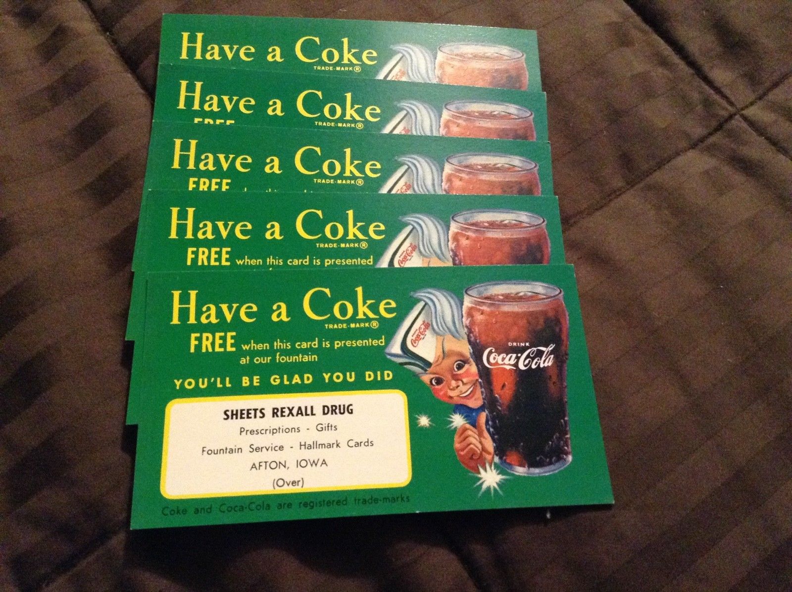 Title (ebay affiliate link): 5 Vintage Card Stock Coupons Classic Coke Trademark Image Afton IA Sheets Rexall
