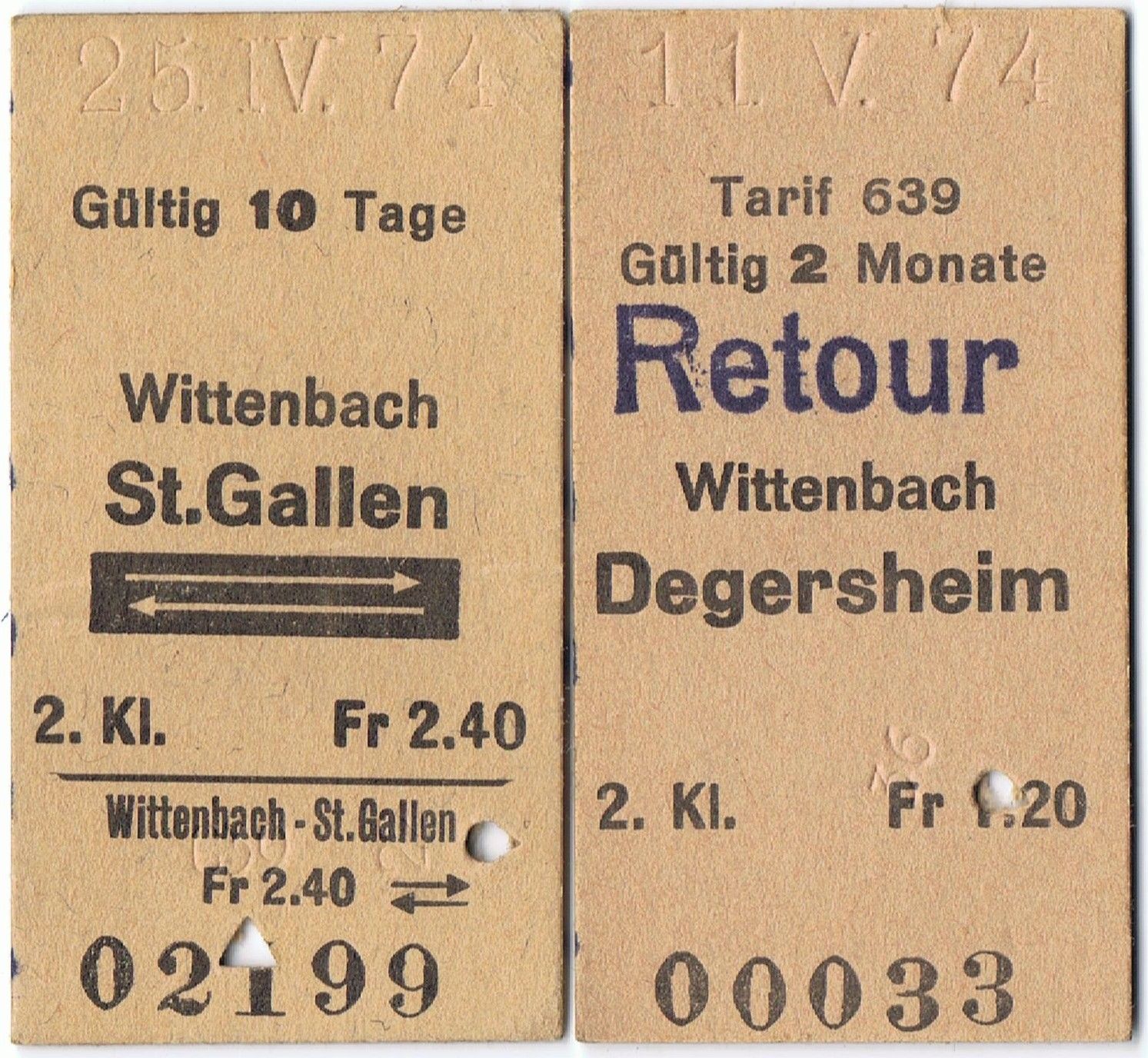 Railway tickets Switzerland Wittenbach second class issues used 1974