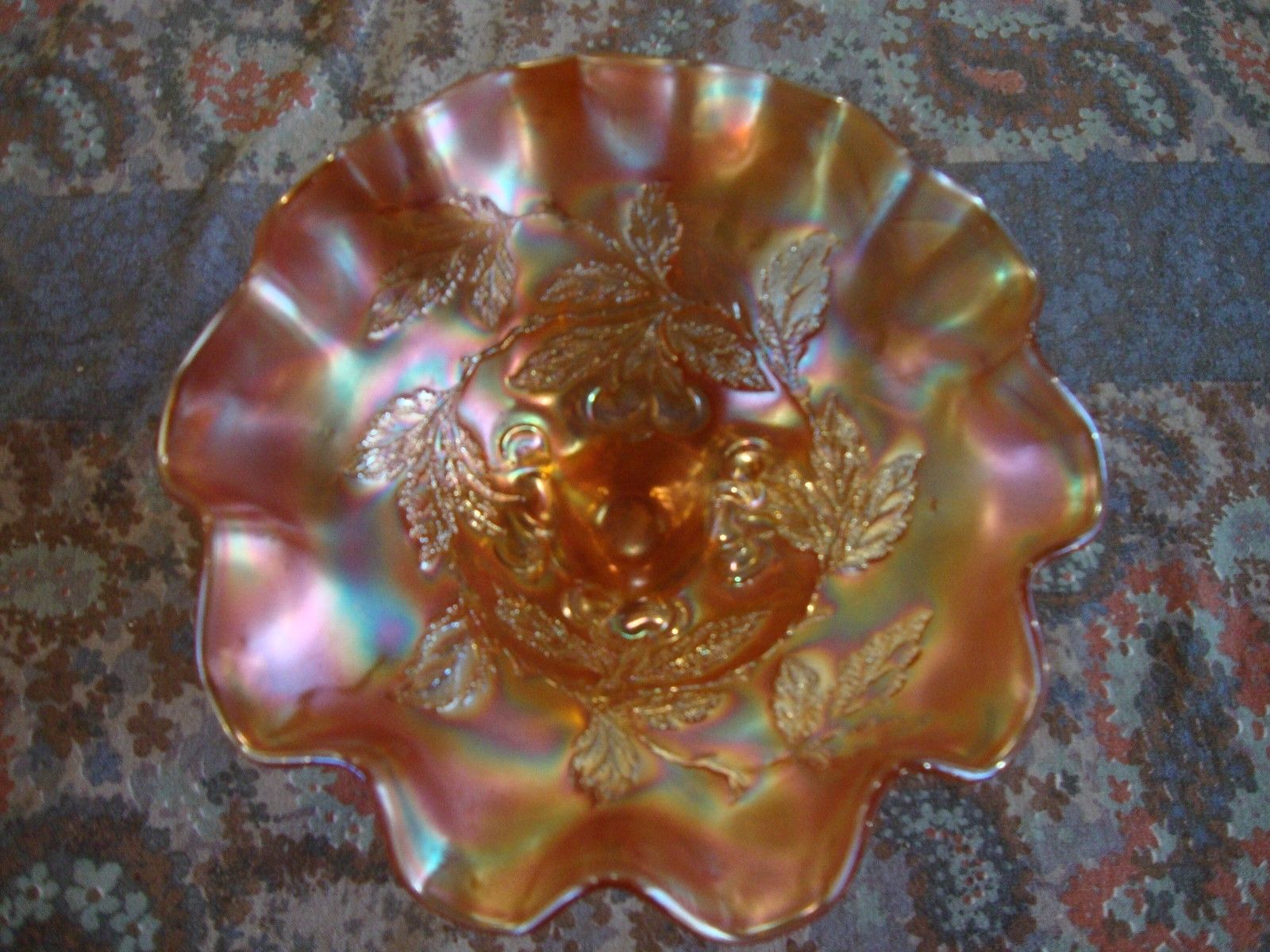 Title (ebay affiliate link): VINTAGE RUFFLE EDGE MARIGOLD IRIDESCENT FOOTED DEPRESSION GLASS BOWL CHERRIES