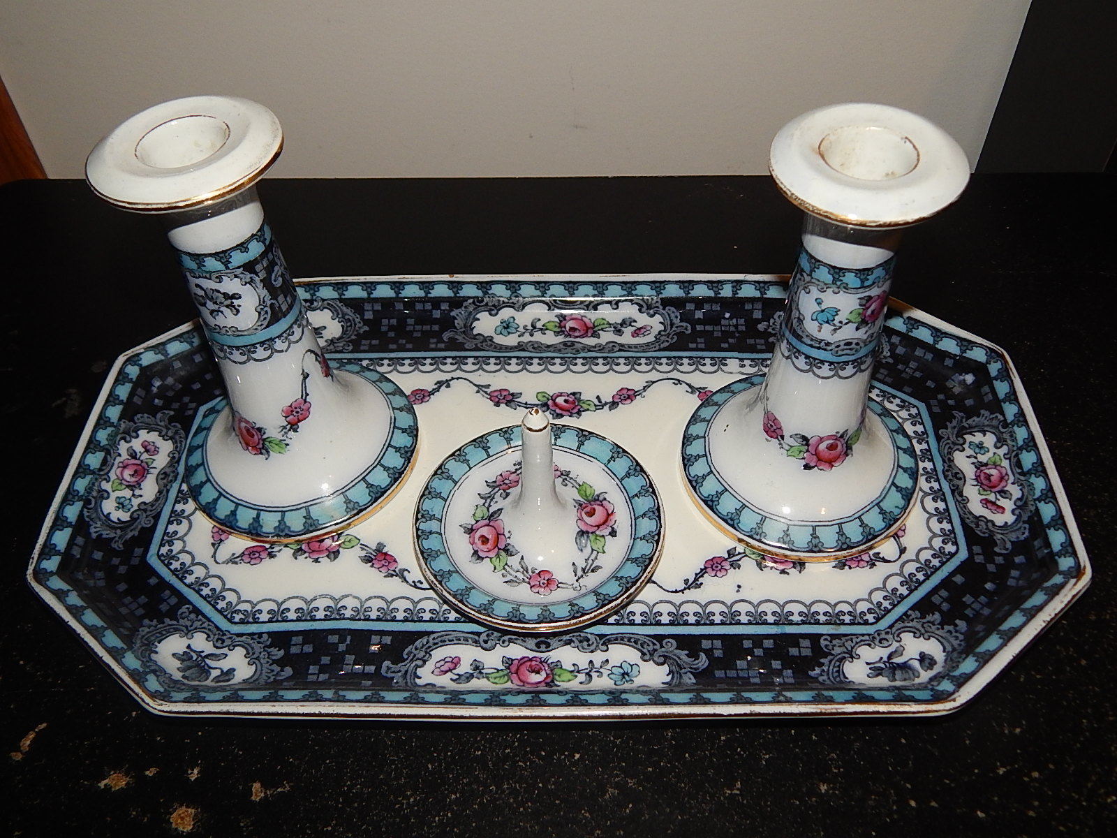 Title (ebay affiliate link): Losol Ware Bathurst Beautifully Ornate Porcelain Candelabras, tray, ring holder