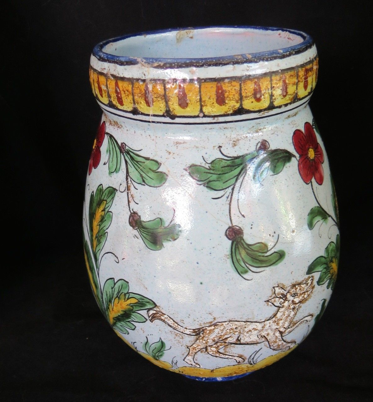 Very Old Faience Jar Pot Decorated Floral and Dog ?