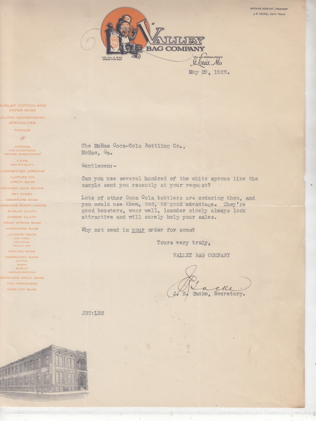 VALLEY BAG COMPANY ST. LOUIS, MO.DATED MAY 29, 1929 Sold to the Coca-Cola plants