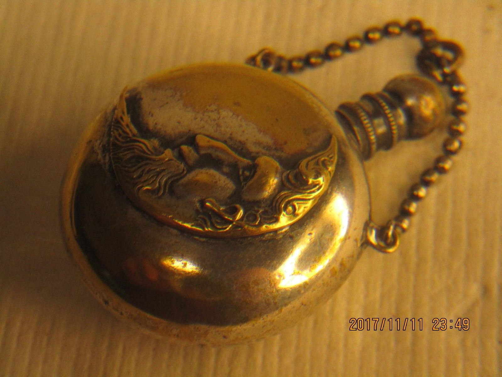 ANTIQUE SILVER ON BRASS MAN IN THE MOON CHATELAINE PERFUME BOTTLE