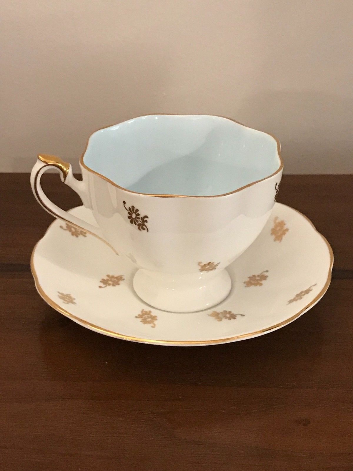 Queen Anne Tea Cup and Saucer Vintage Gold /White/Light Blue Bowl