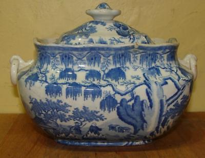 Antique Blue Transfer Decorated Pearlware Sugar Bowl, Ring Handles, c. 1800