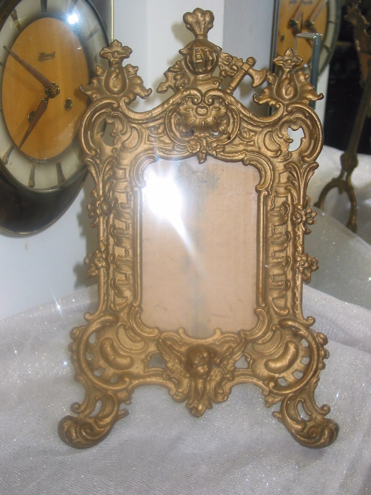 Title (ebay affiliate link): ANTIQUE Heavy Metal Knight & Cherub Easel Picture FRAME Gold Gilt DSP