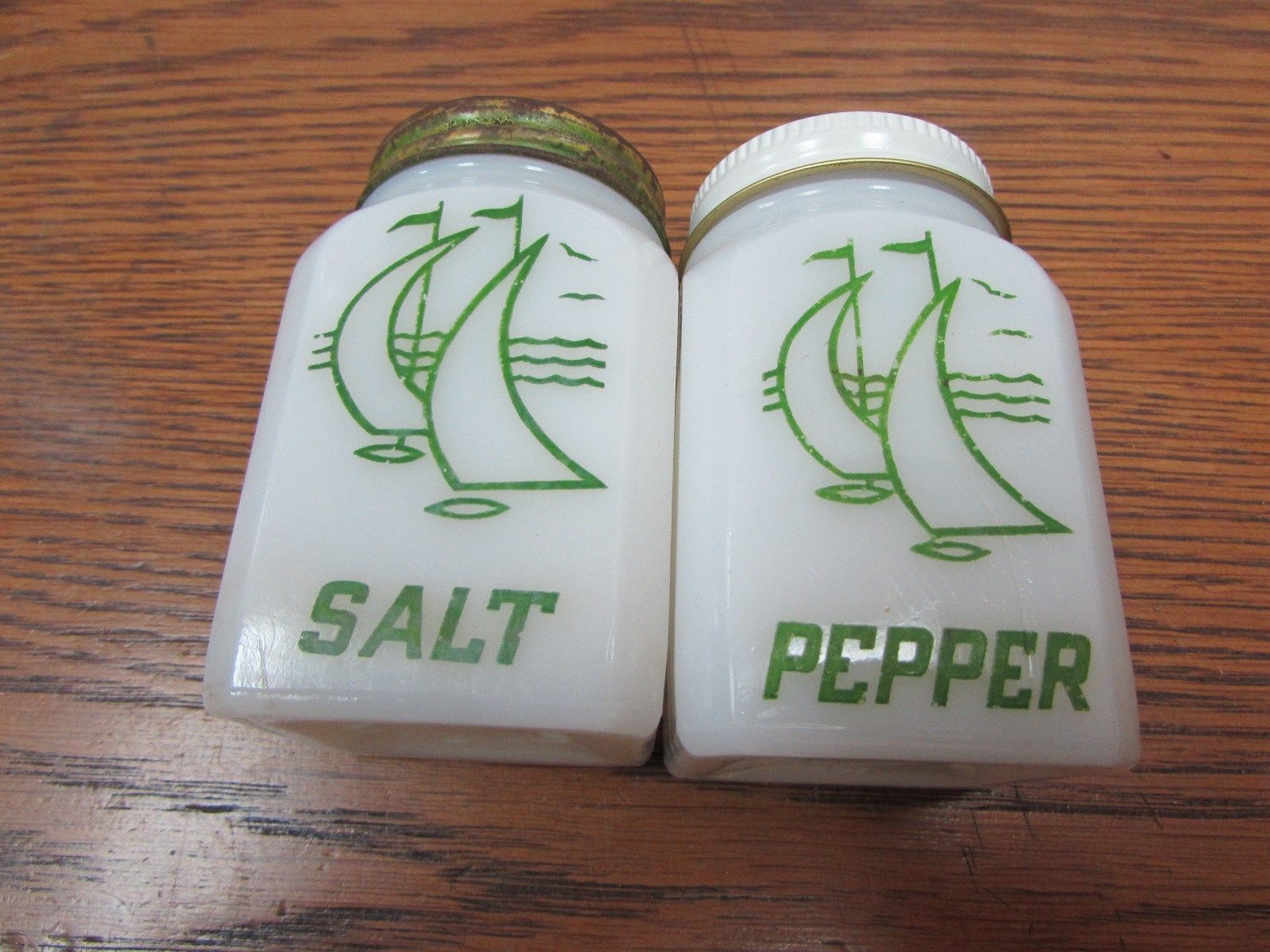 Title (ebay affiliate link): Hazel Atlas Milk Glass Salt and Pepper Shakers Rare Green Sailboats CA4