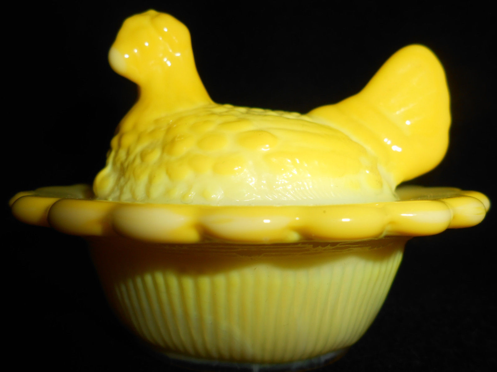 Vaseline yellow milk glass hen chicken nest basket dish uranium salt dip cellar