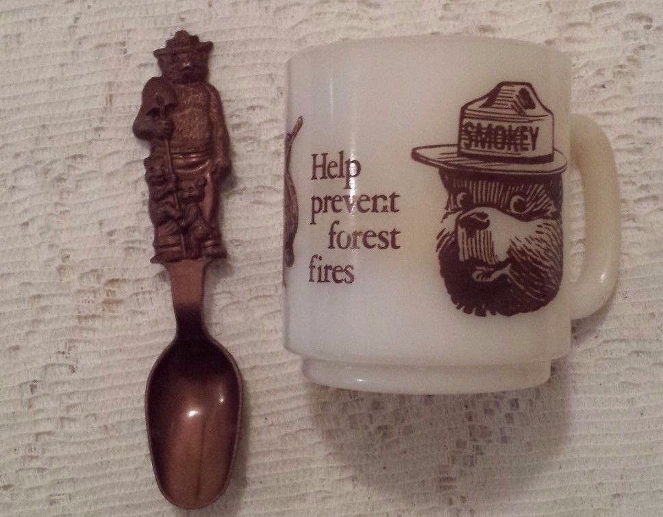 Title (ebay affiliate link): Smokey The Bear Vintage Zoo Pixs Brown Plastic Spoon & Milk Glass Coffee Cup