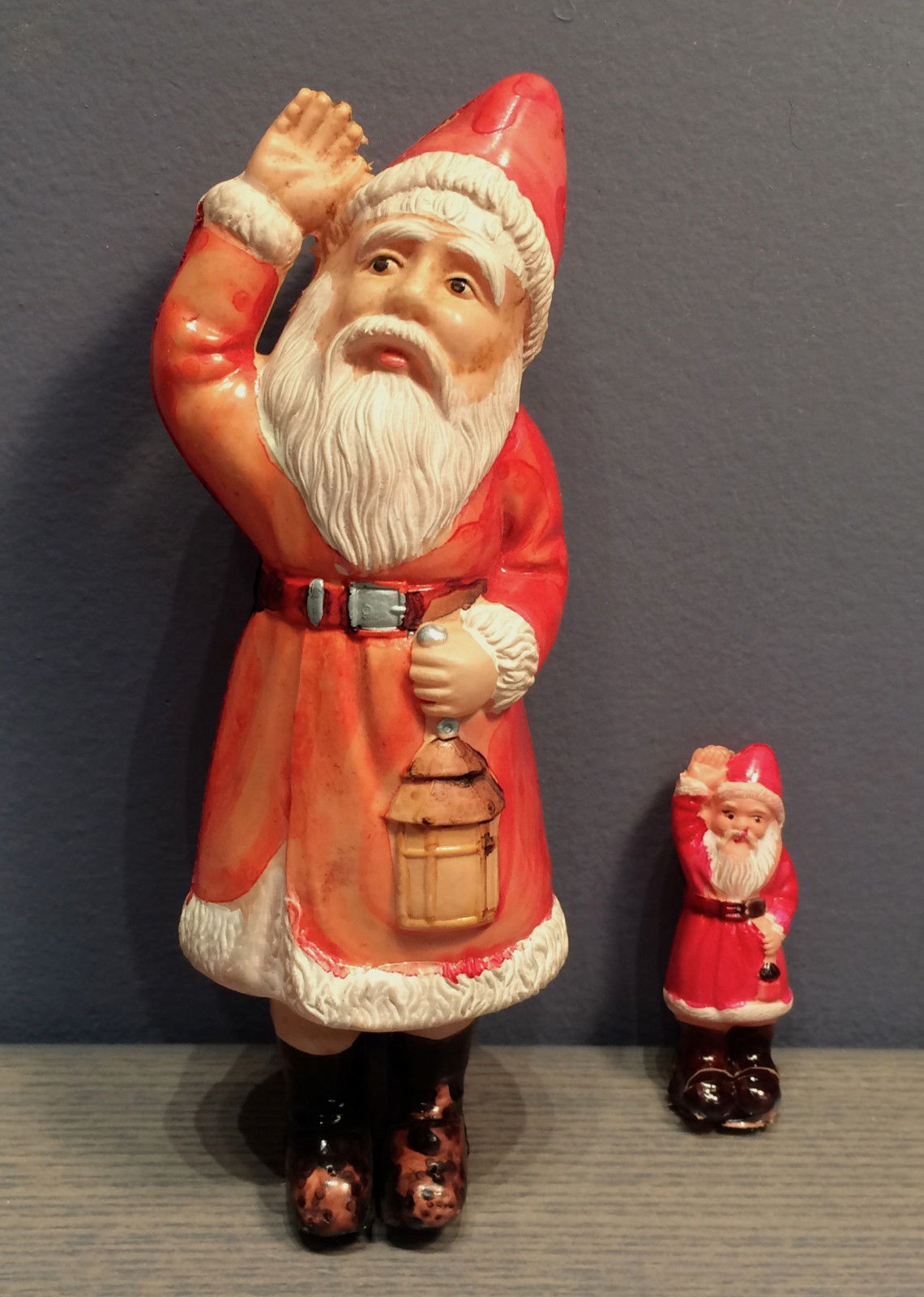 2 Vintage 6 3/4 "& 2 1/2" Celluloid Santa w lantern Made Japan Christmas Toy
