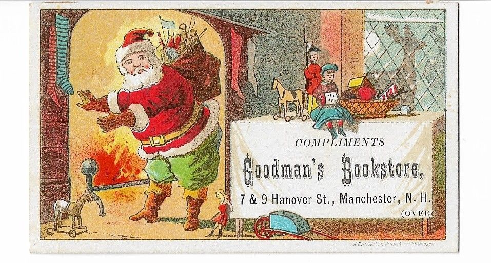 Title (ebay affiliate link): 1885 Trade Card Goodman''s Bookstore Hanover St Manchester NH Santa Christmas