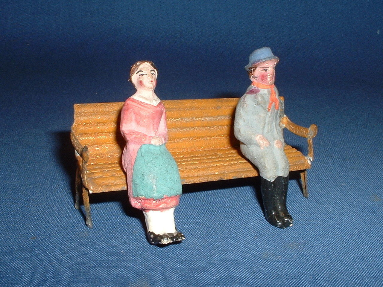 Title (ebay affiliate link): Early German Composition Putz Figures on Tin Bench