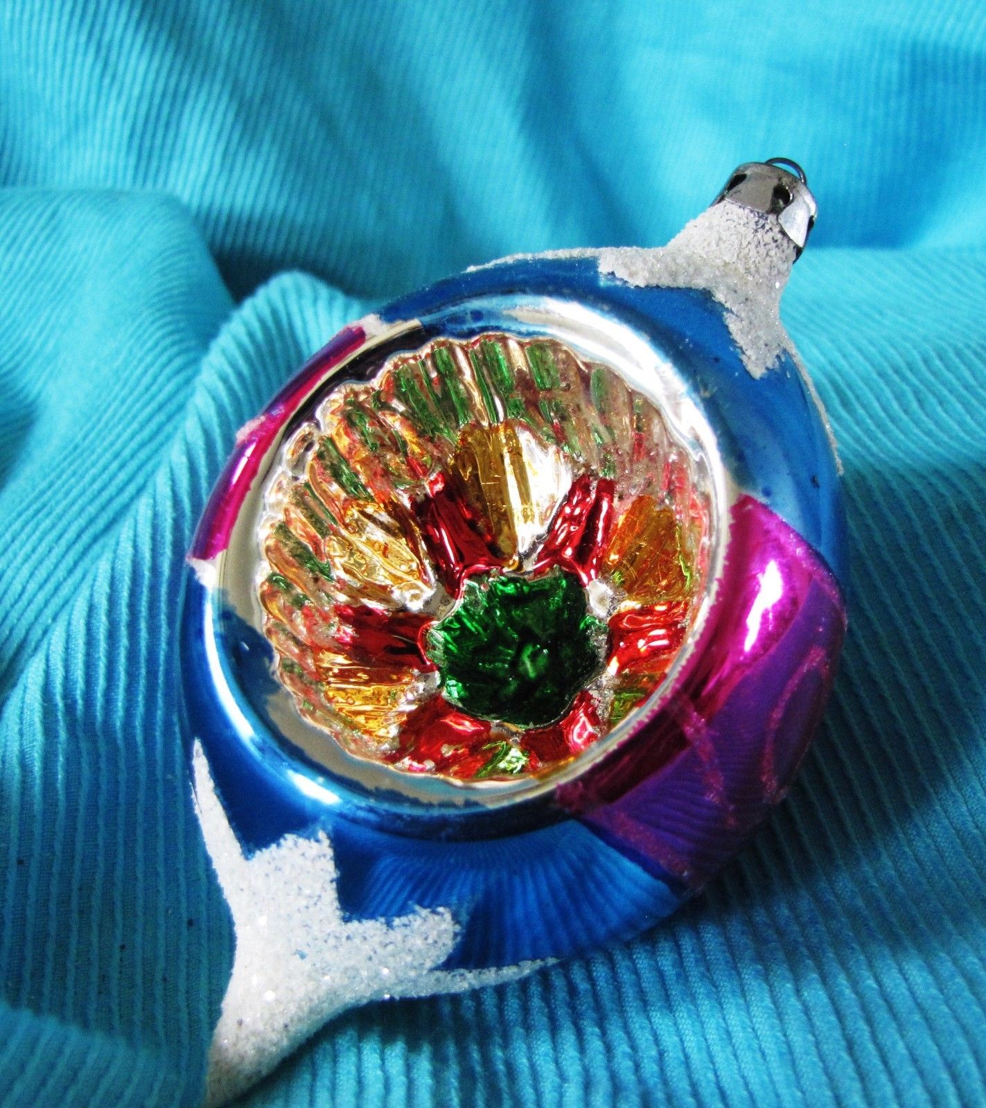 Title (ebay affiliate link): VTG CHRISTMAS GLASS POLAND DEEP INDENT ORNAMENT BLUE & PINK w MICA GLITTER