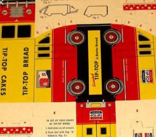 Title (ebay affiliate link): 1950''s Tip Top Bread Cardboard Punch-Out Toy Town Truck Advertising Premium