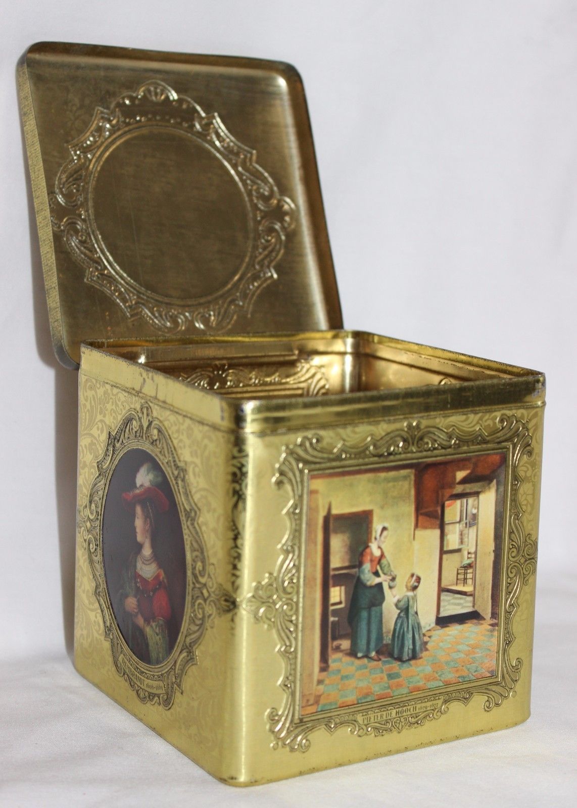Title (ebay affiliate link): Vtg Dutch Renaissance Square Hinged Tin Container Holland Tea Caddy Candy Box