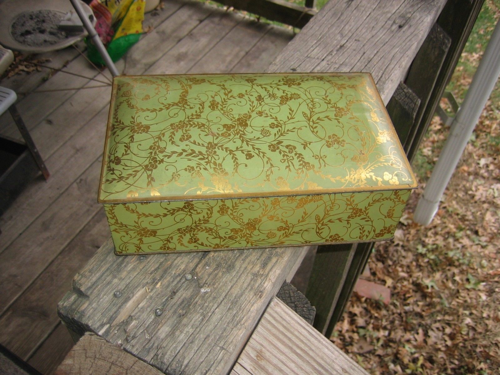Title (ebay affiliate link): ANTIQUE CANDY CHOCOLATE TIN McNALLY-DOYLE CLEVELAND OHIO 1910-1950 GOLD GREEN