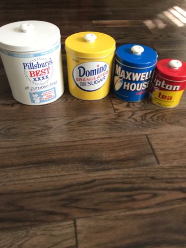 Title (ebay affiliate link): Vintage JL Clark Kitchen Tin Canister Set Pillsbury, Domino, Lipton and Maxwell