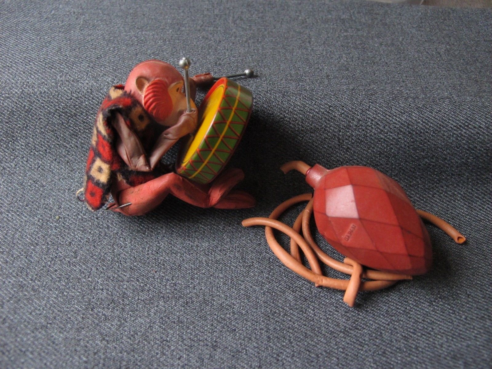 Title (ebay affiliate link): ANTIQUE RUBBER FABRIC & TIN SQUEEZE PUMP MECHANICAL MONKEY DRUMMER TOY JAPAN