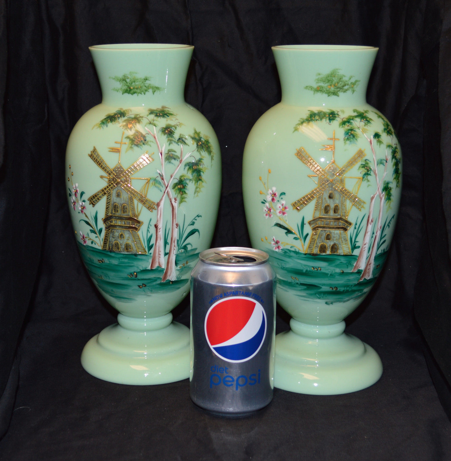2 Beautiful Bristol Glass Vases - Large 11" High - Windmills - Jadite Green