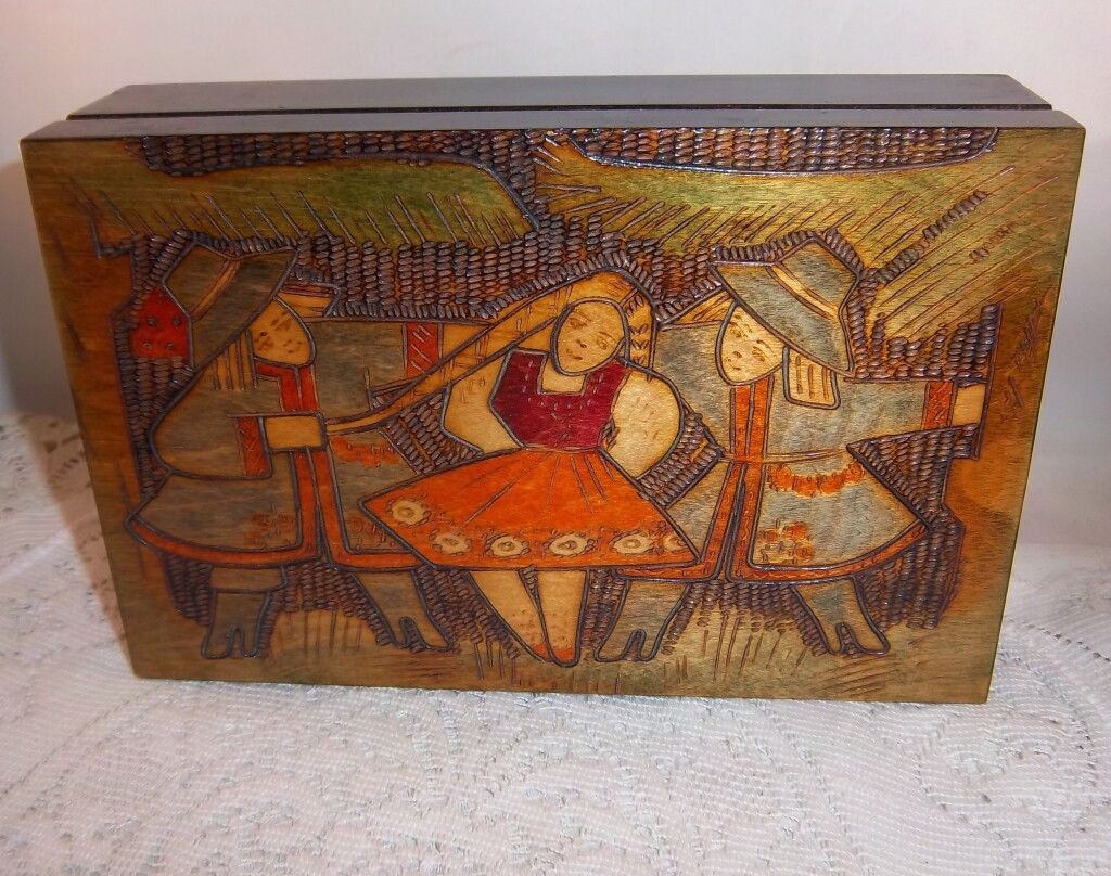 Antique European Wooden Box Hand Carved 3 Children at Play
